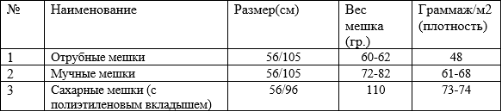 1. Отрубной мешок, размер 56х105, вес 60-62гр., плотность материала 48 гр./м2. 2. Мучные мешки изготавливаются в зависимости от пожеланий заказчика. Есть возможность изготовить из ткани плотностью от 61-го до 68-и гр./м2, соответственно вес стандартного мешка размером 56х105 может варьироваться от 72-ух до 82-ух грамм, по разрывным показателям любые мешки соответствуют ГОСТу. 3. Мешки двухслойные для упаковки сыпучих пищевых продуктов (сахара) состоят из полипропиленового мешка размером 56×96см и полиэтиленового мешка-вкладыша размером 58×102см. Полиэтиленовый вкладыш расправлен и вставлен внутрь полипропиленового мешка (готовы выслать Вам образцы мешков по адресу, который Вы нам укажите), верх мешка подвернут и прошит вместе с полиэтиленовым вкладышем. Качественный шов выполнен ультразвуковой швейной машинкой. Также наносится маркировка, согласно требованиям ЕАЭС. Вес одного мешка 110±2 грамма, цвет мешка молочно-белый.